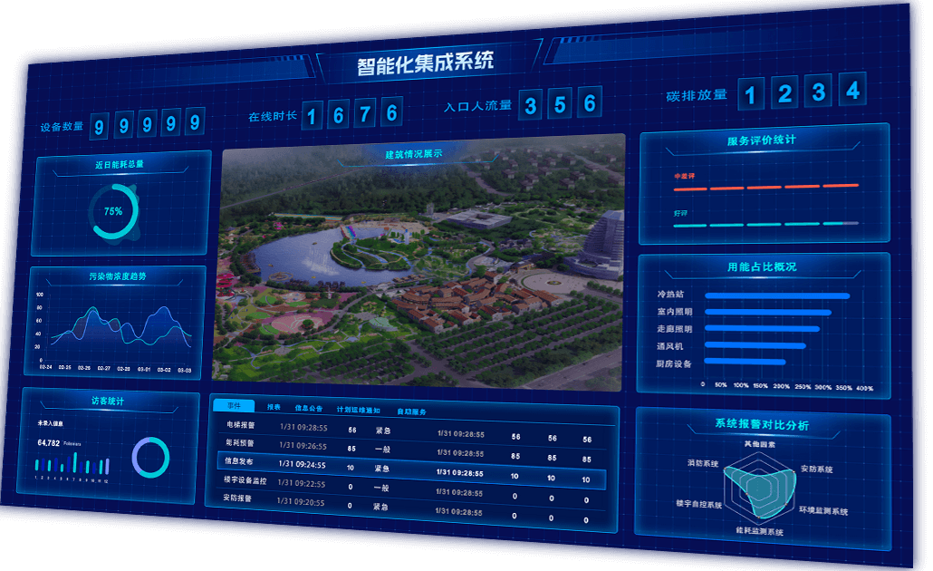 將建筑的弱電子系統(tǒng)進行集成,基于可視化顯示與配置,進行集中監(jiān)視和管理,可直觀展示系統(tǒng)實時運行參數(shù)及狀態(tài)。