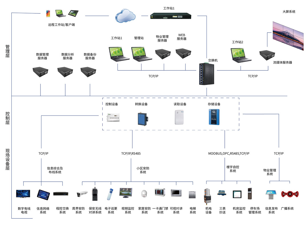 智能化集成系統(tǒng)是基于互聯(lián)網(wǎng)、物聯(lián)網(wǎng)、私有云、大數(shù)據(jù)、AI識別等技術(shù)為核心,高于智能化系統(tǒng)的綜合性智能化管理平臺。將具備不同功能的建筑智能化系統(tǒng),通過統(tǒng)一的信息平臺集成,對各個子系統(tǒng)全程集中監(jiān)視和管理。使各個原本獨立的子系統(tǒng),在統(tǒng)一的平臺上互相交互,形成信息匯集、資源共享及優(yōu)化管理等綜合功能的智能化集成管理平臺。