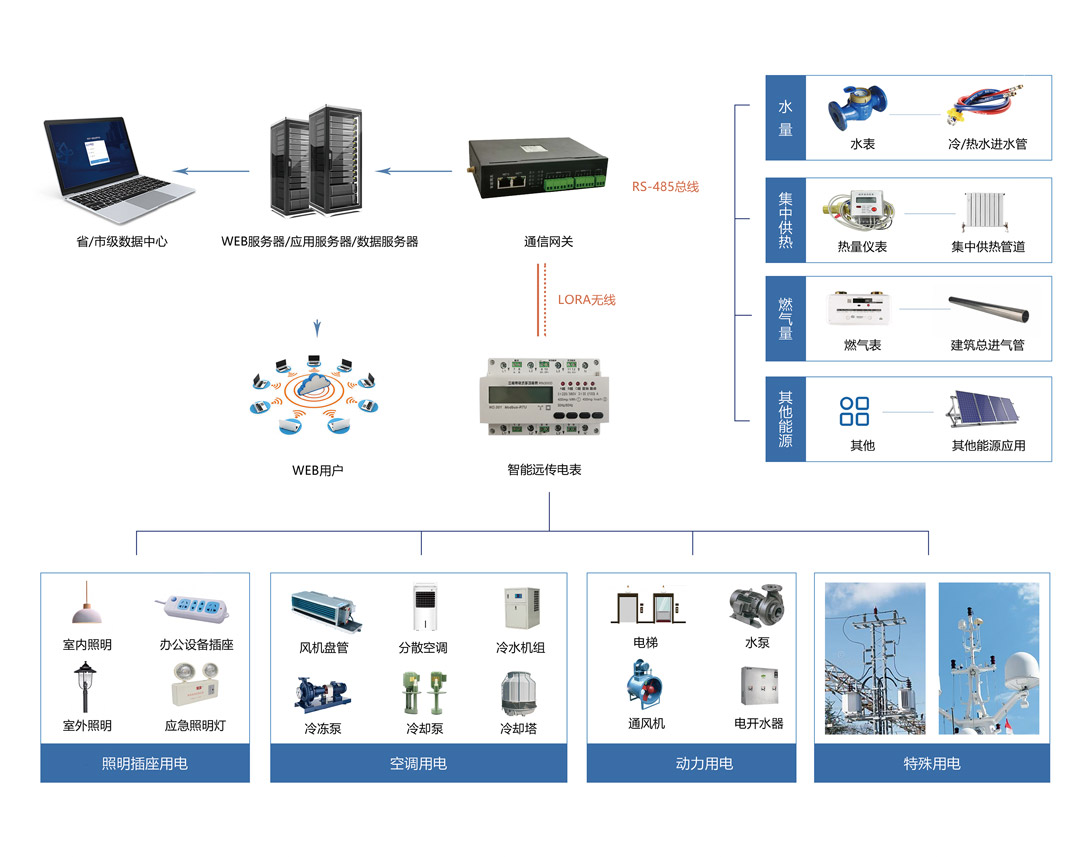 能耗監測系統通過對電表、水表、熱量表、燃氣表等計量表數據的在線監測、采集、傳輸、報警、建模和運算,實現分類(水、電、暖、氣)、分項(空調、照明插座、動力、特殊用電)和分區(樓宇、樓層、部門、房間)綜合能源使用管理。深挖能源管理數字化轉型痛點,解決用能單位能耗數據可視性差、數據孤島難打破、巡檢方式落后、缺乏統一調度等難點。